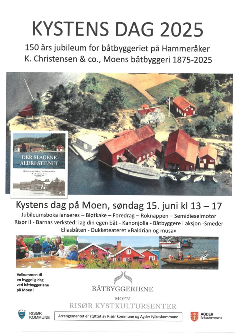 Program for Kystens Dag: Kl 11.00: Avreise fra Risør havn med M/F «Øisang». Tokt gjennom skjærgården, Nordfjorden og Sørfjorden med ankomst Moen. Historiske guider om bord. «Øisang» drar tilbake til Risør kl 15 Hammeråker: Kl 14.00: Åpning av Kystens dag